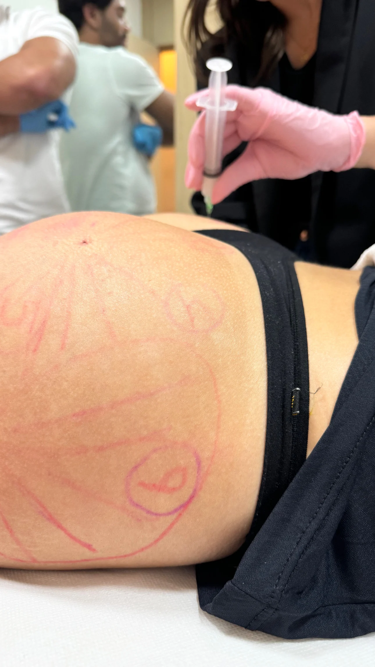 With the use of collagen biostimulators and hyaluronic acid in strategic points of the buttocks, we are able to increase the dermal thickness of the skin (treating sagging) and create a lifting effect (with the appropriate number of sessions for each case).